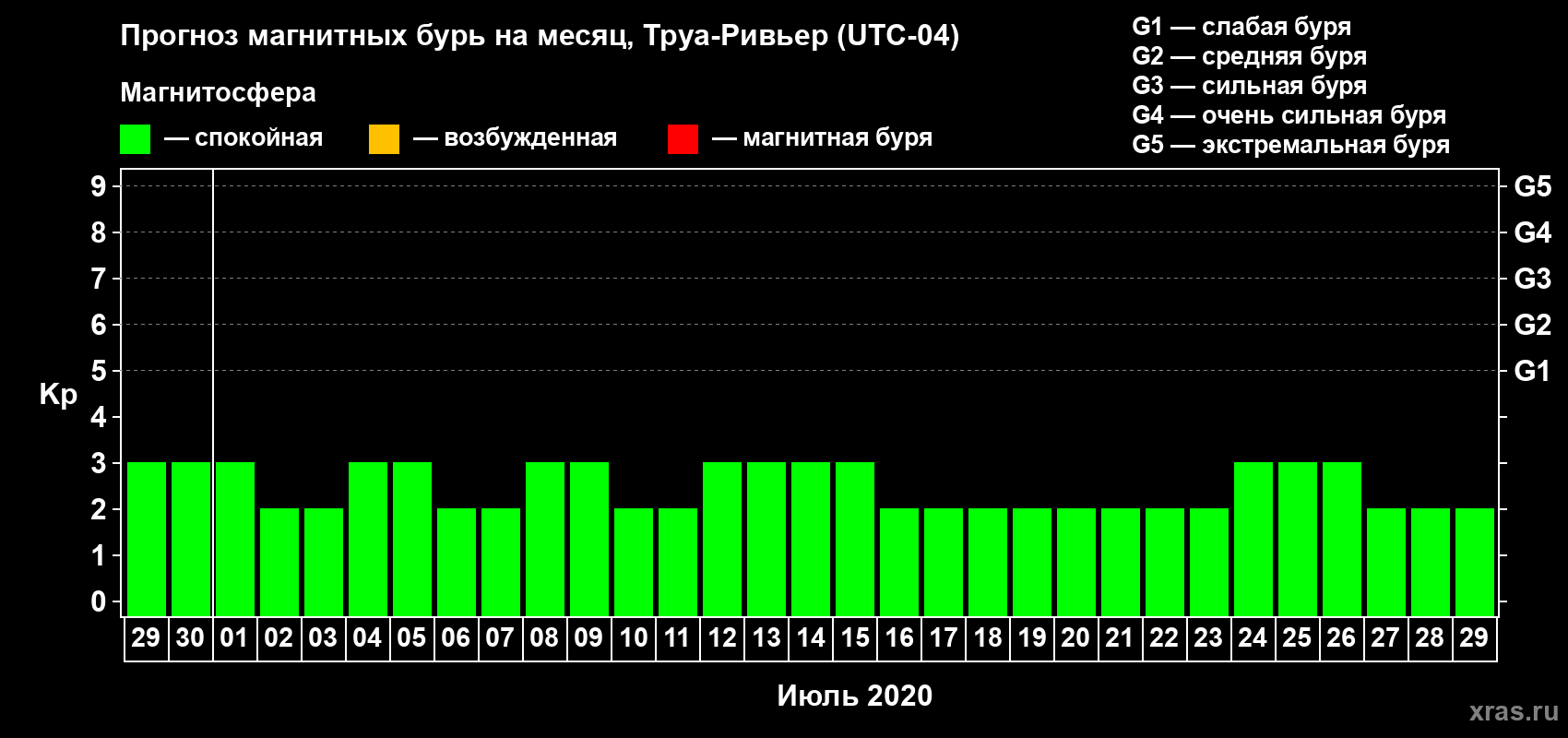Прогноз магнитных бурь в Труа-Ривьере — 29 июня 2020 года