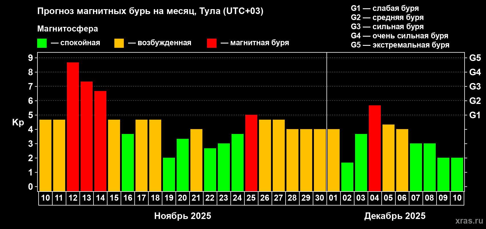 Прогноз магнитных бурь в Туле на 10 ноября 2025 года