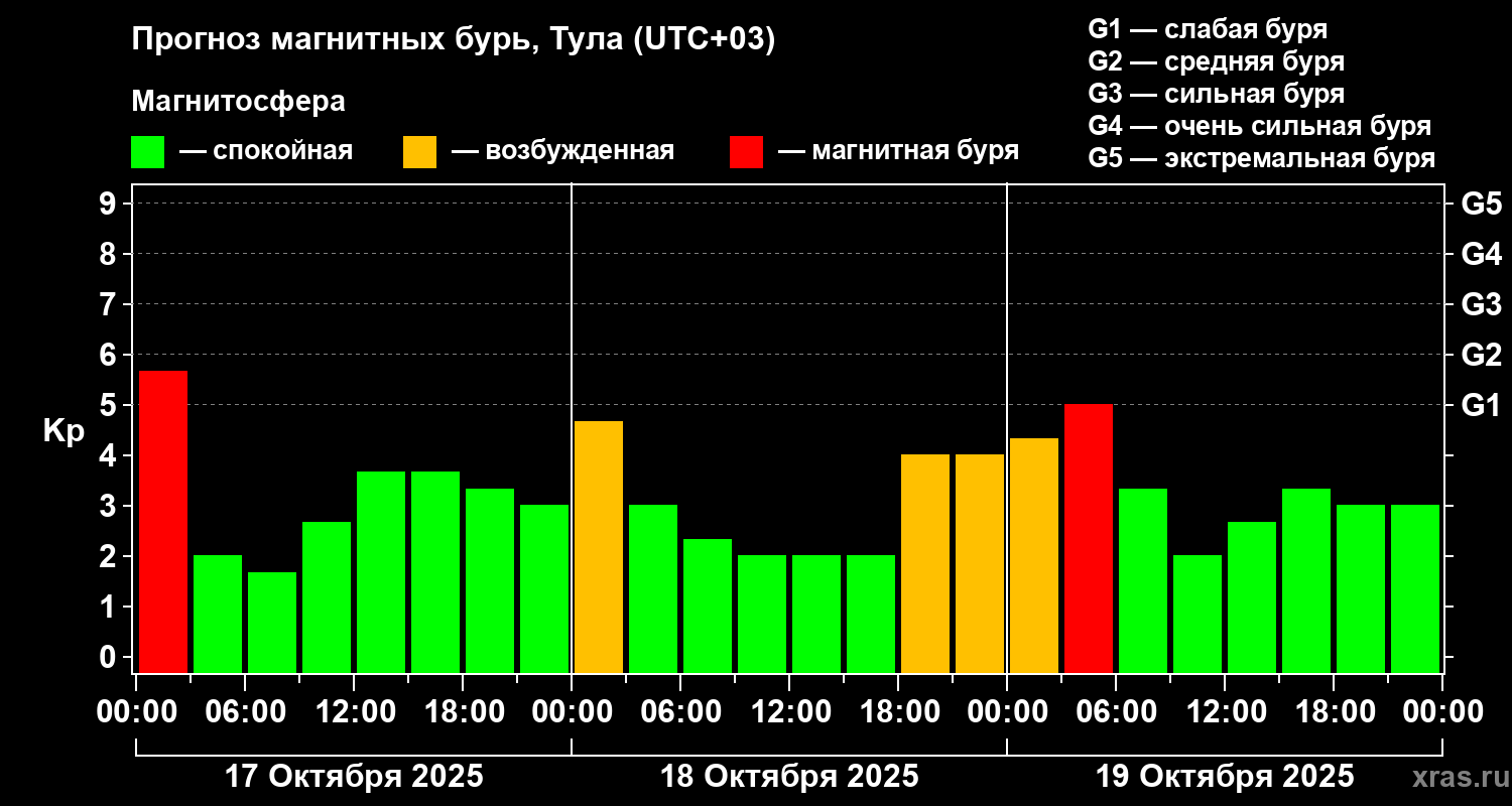 Прогноз магнитных бурь в Туле на 17 октября 2025 года