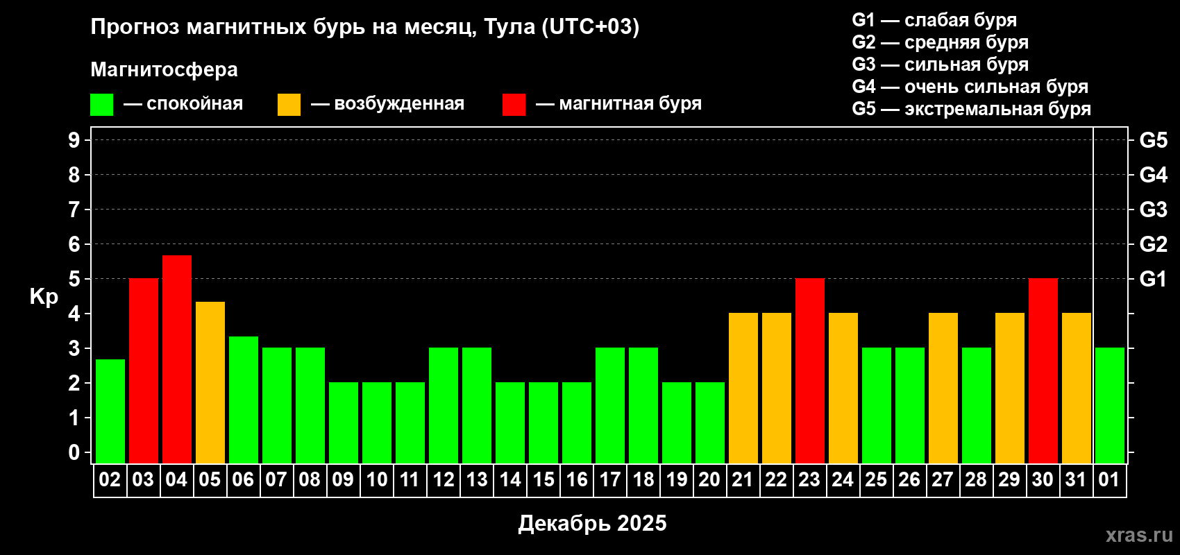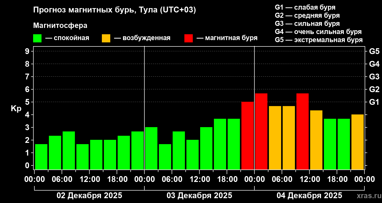Прогноз магнитных бурь в Туле на 2 декабря 2025 года