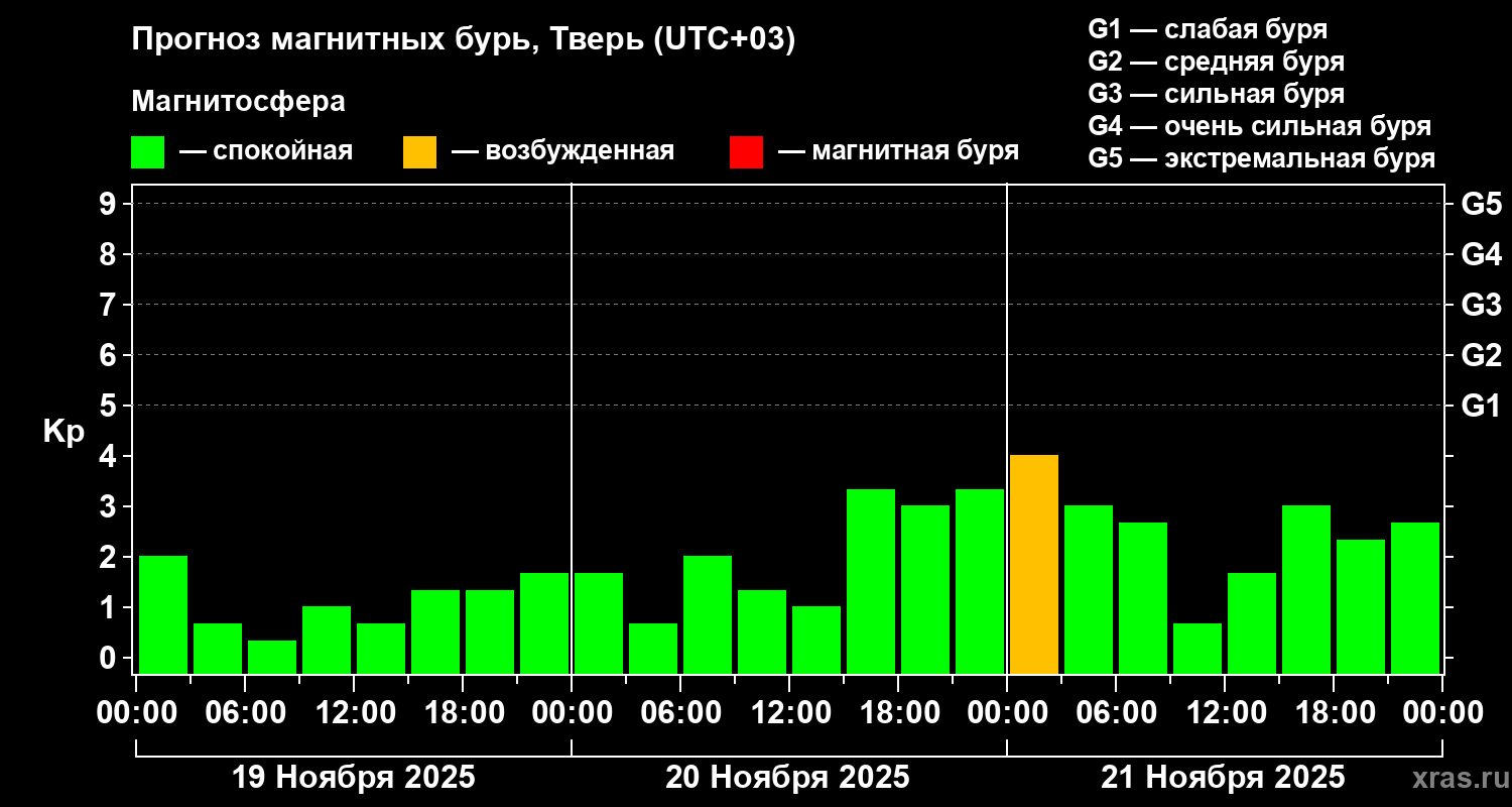Прогноз магнитных бурь Твери — 19 ноября 2025 года