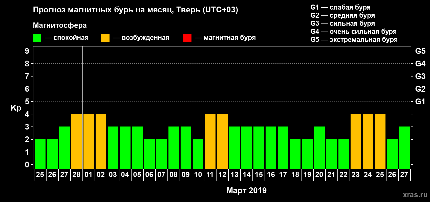 Прогноз максимального суточного геомагнитного индекса Kp на 1 месяц (31 день) с 25 февраля по 27 марта 2019 г