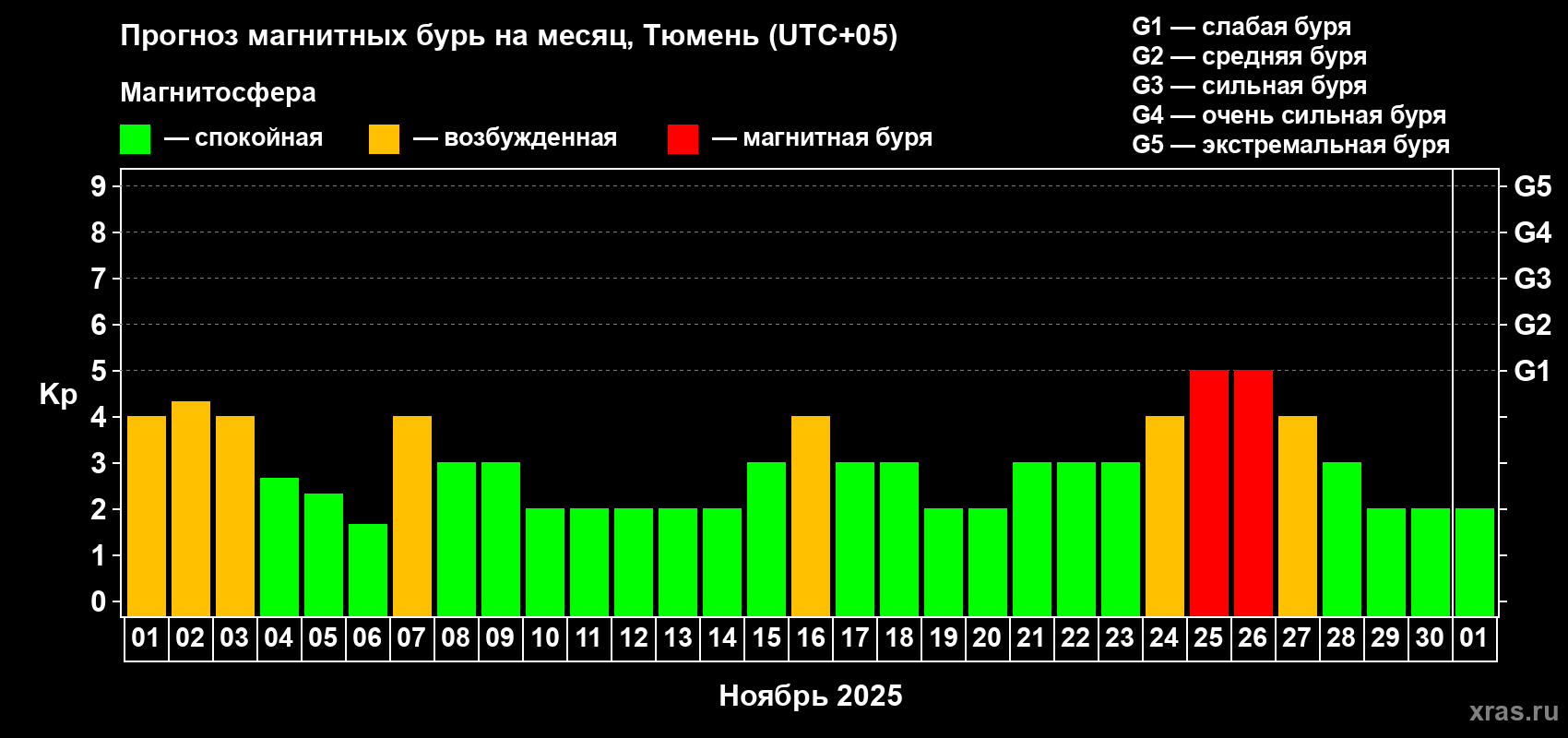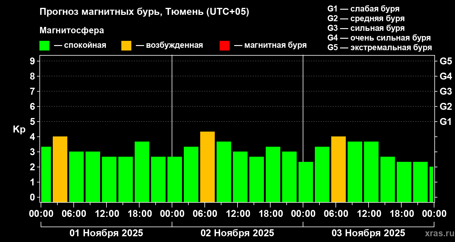 Прогноз магнитных бурь Тюмени — 1 ноября 2025 года