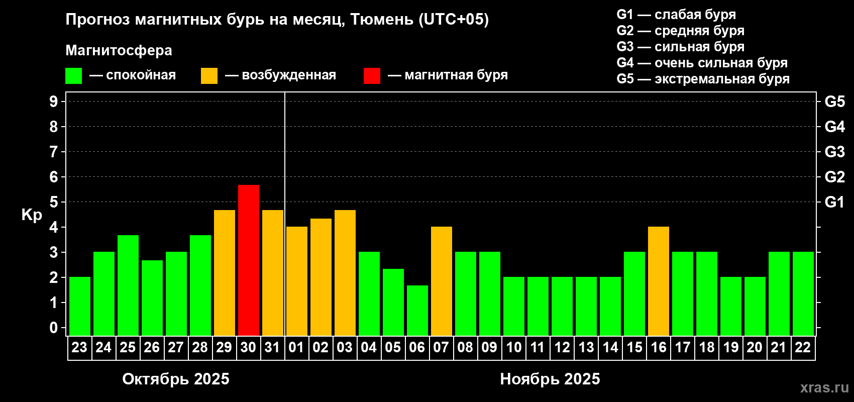 Прогноз магнитных бурь Тюмени — 23 октября 2025 года