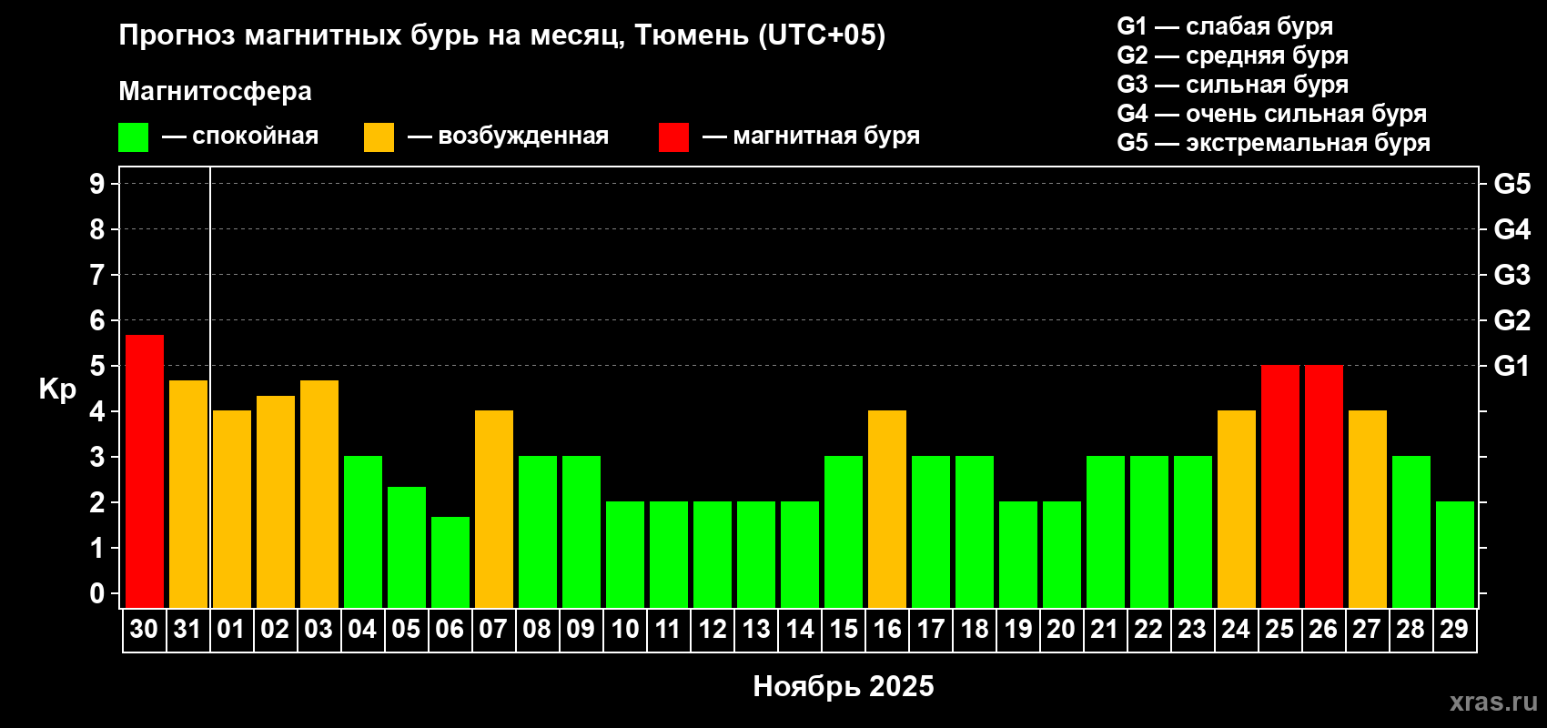Прогноз магнитных бурь Тюмени — 30 октября 2025 года