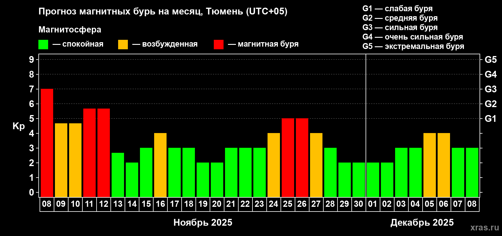 Прогноз магнитных бурь Тюмени — 8 ноября 2025 года