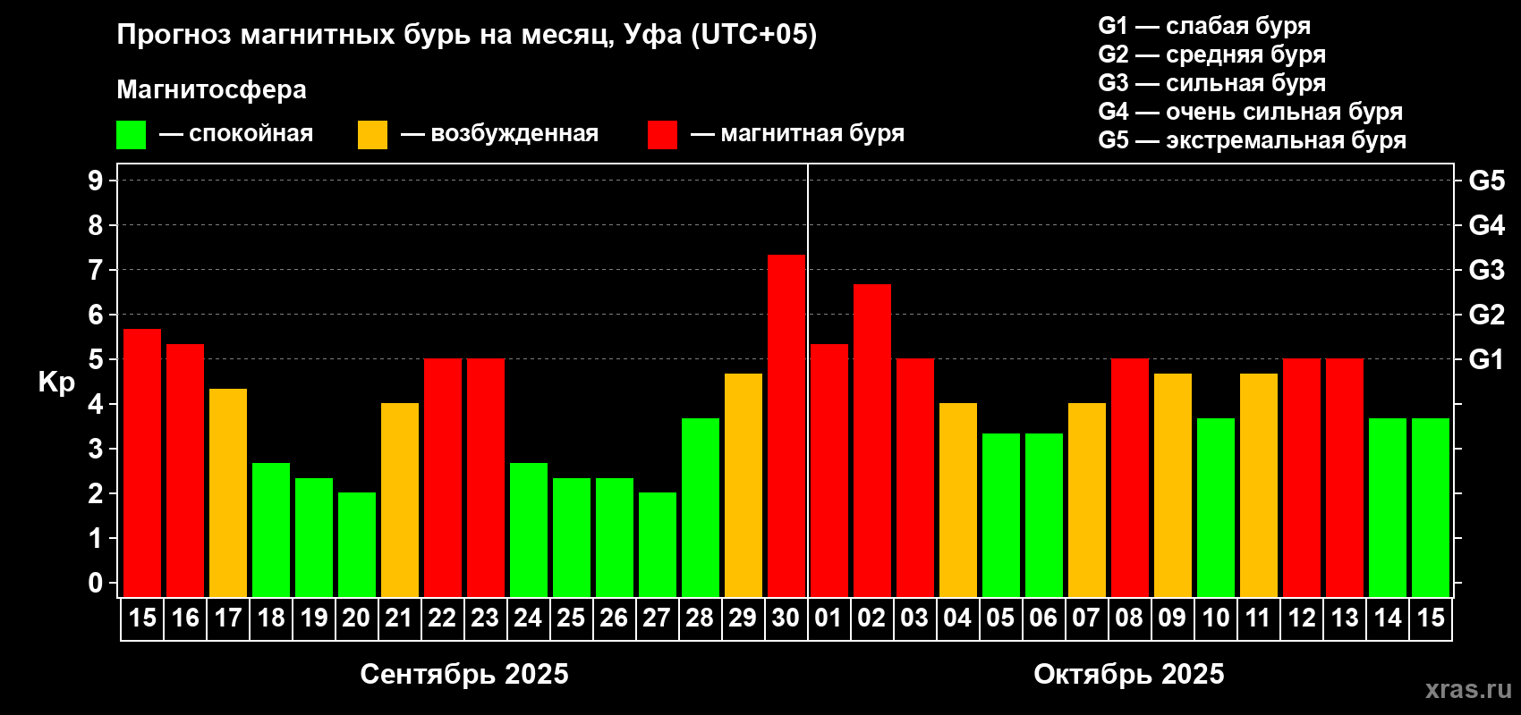 Прогноз магнитных бурь в Уфе — 15 сентября 2025 года