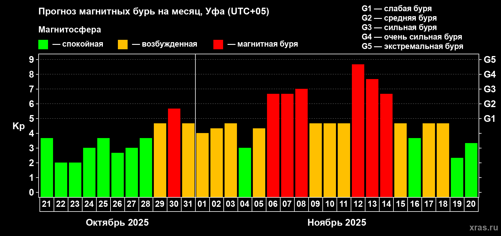 Прогноз магнитных бурь в Уфе — 21 октября 2025 года
