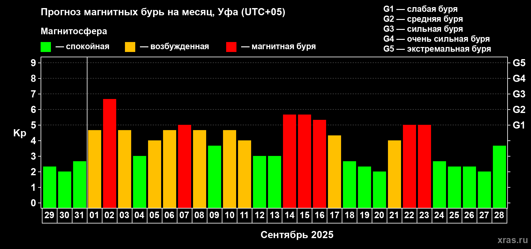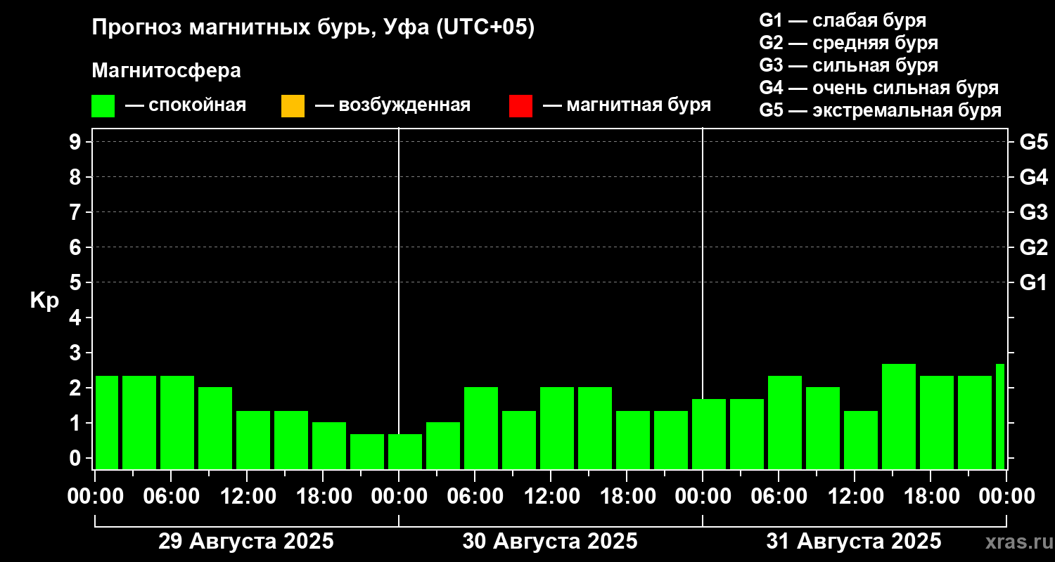 Прогноз магнитных бурь в Уфе — 29 августа 2025 года