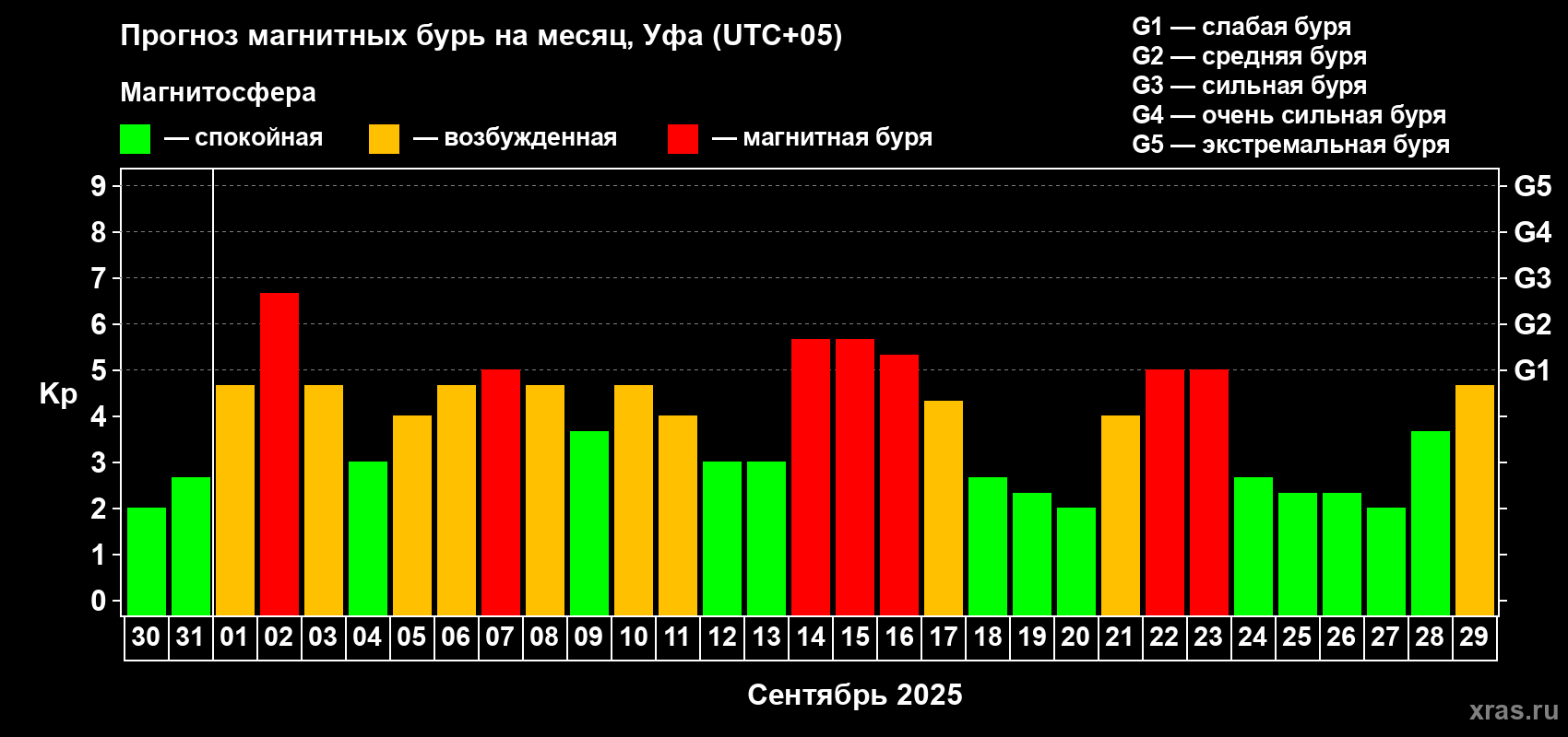 Прогноз магнитных бурь в Уфе — 30 августа 2025 года