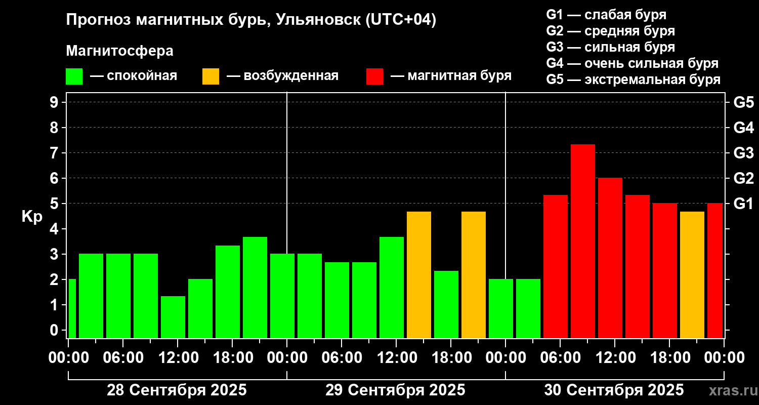 Прогноз магнитных бурь в Ульяновске — 28 сентября 2025 года