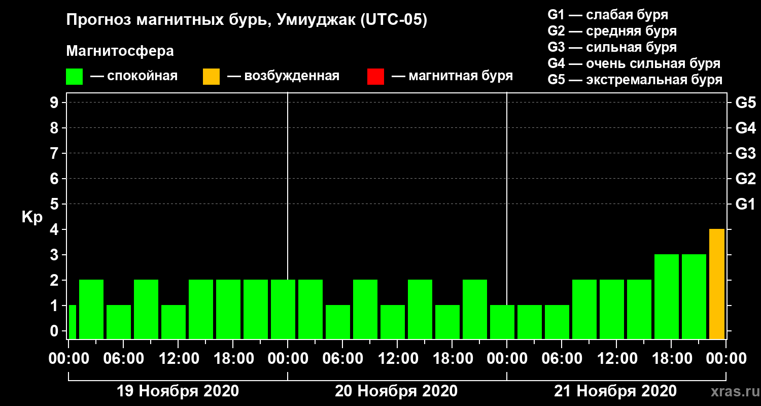 Прогноз магнитных бурь в Умиуджаке — 19 ноября 2020 года