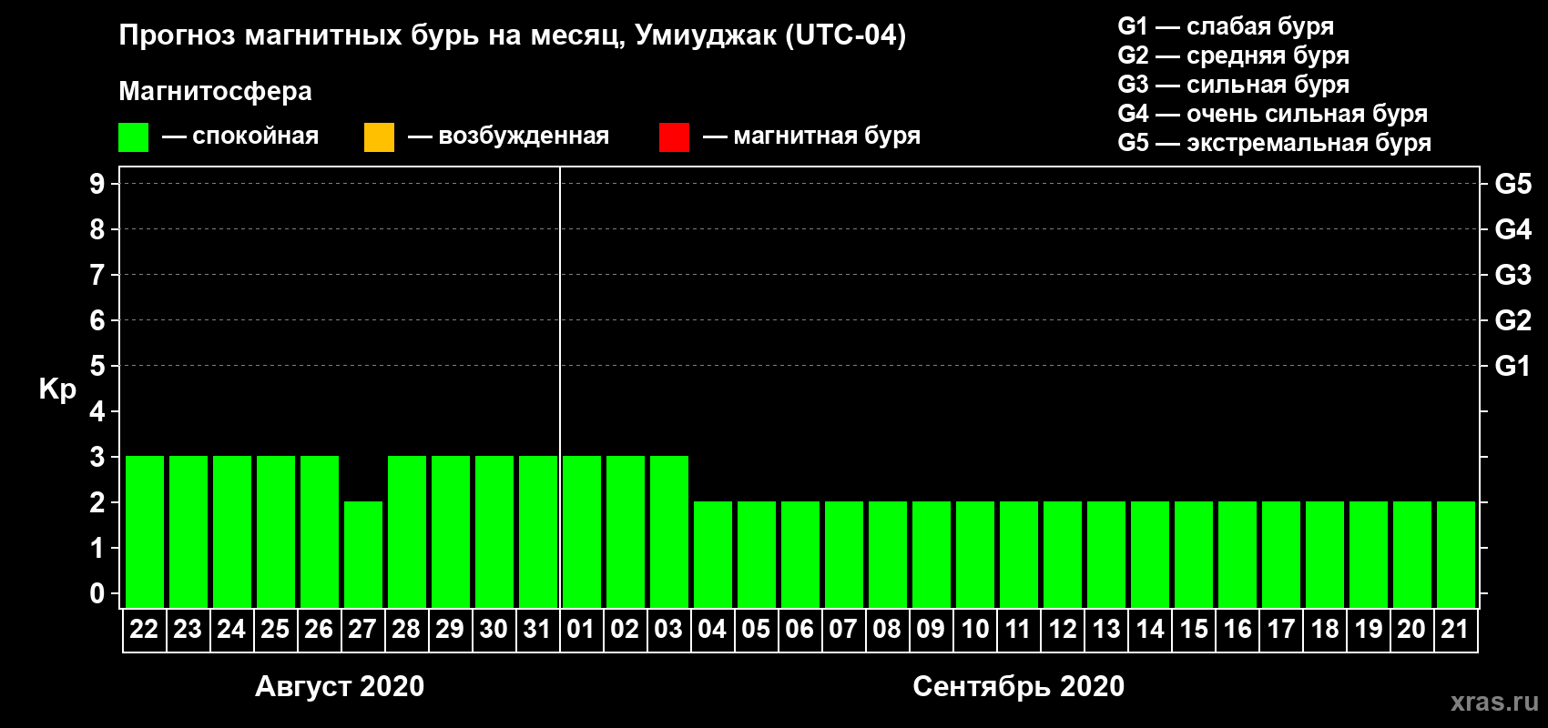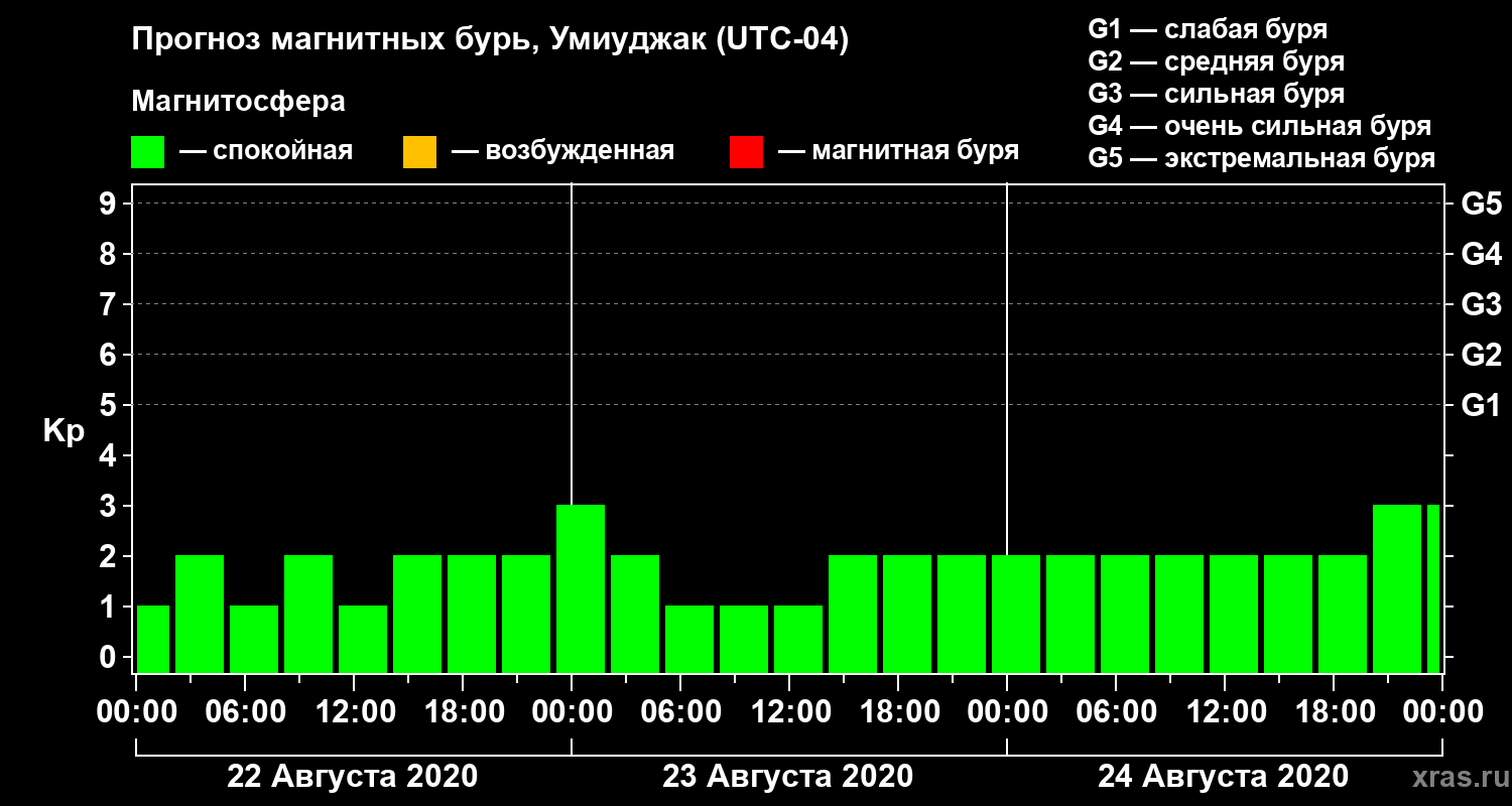 Прогноз магнитных бурь в Умиуджаке — 22 августа 2020 года
