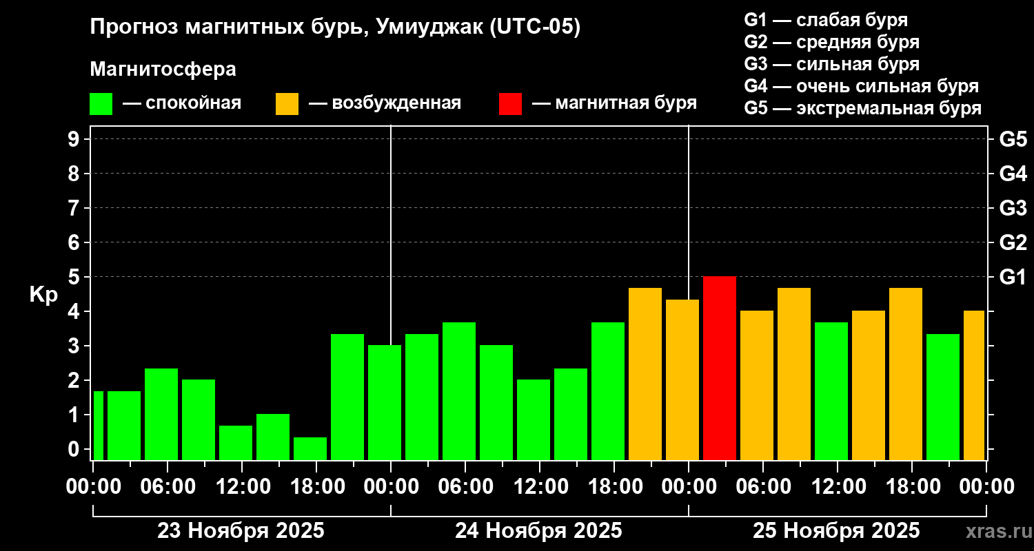 Прогноз магнитных бурь в Умиуджаке — 23 ноября 2025 года