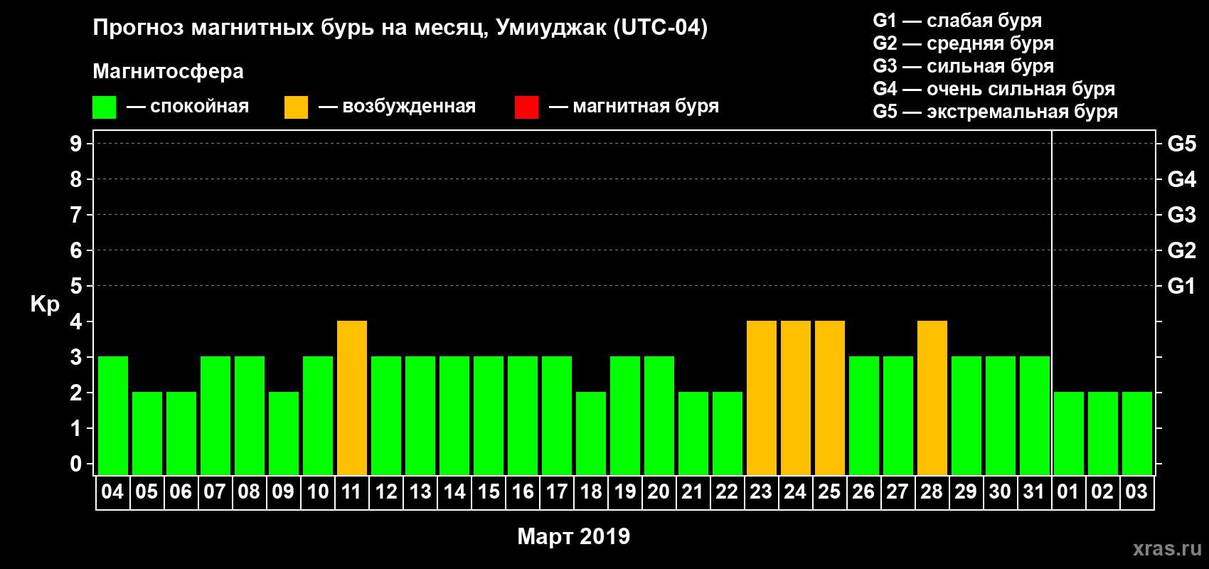 Прогноз магнитных бурь в Умиуджаке — 4 марта 2019 года