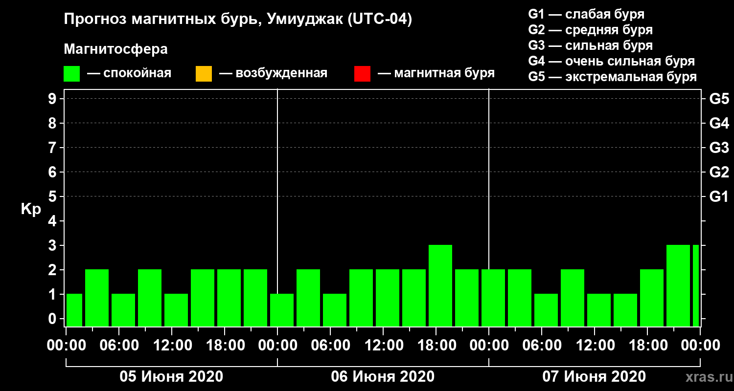 Прогноз магнитных бурь в Умиуджаке — 5 июня 2020 года