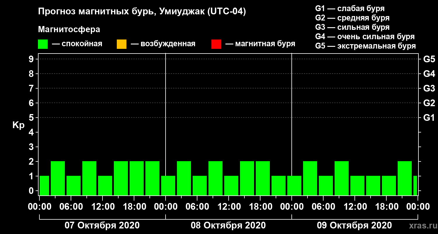 Прогноз магнитных бурь в Умиуджаке — 7 октября 2020 года