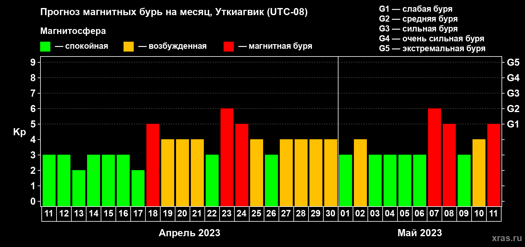 Прогноз магнитных бурь в Уткиагвике — 11 апреля 2023 года