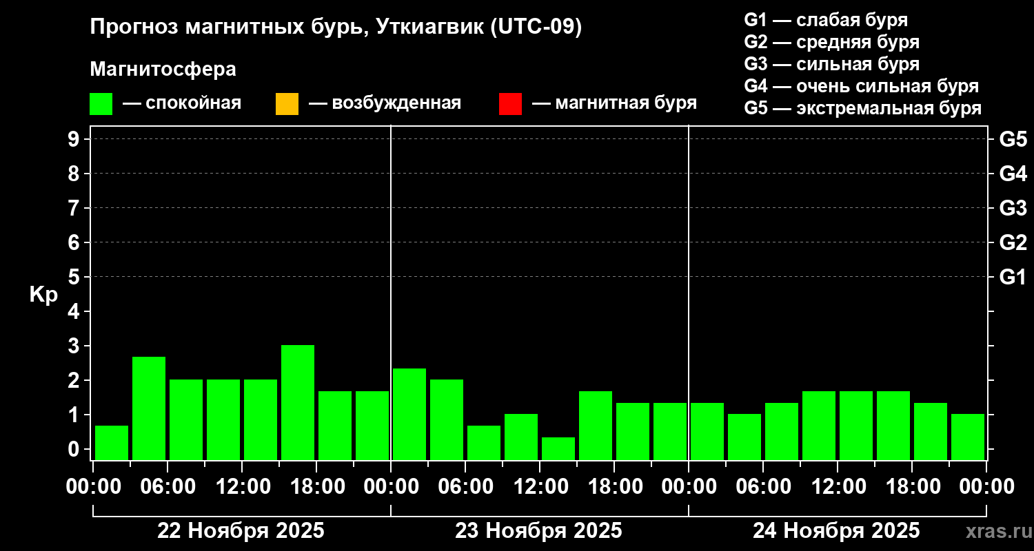 Прогноз магнитных бурь в Уткиагвике — 22 ноября 2025 года