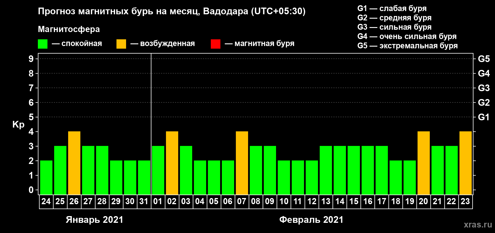 Прогноз магнитных бурь в Вадодаре — 24 января 2021 года