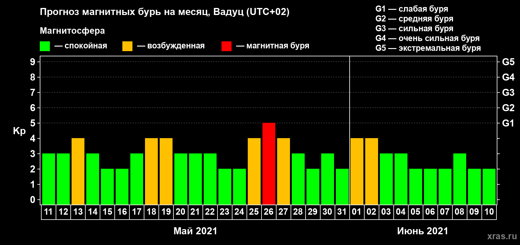 Прогноз магнитных бурь в Вадуце на 11 мая 2021 года