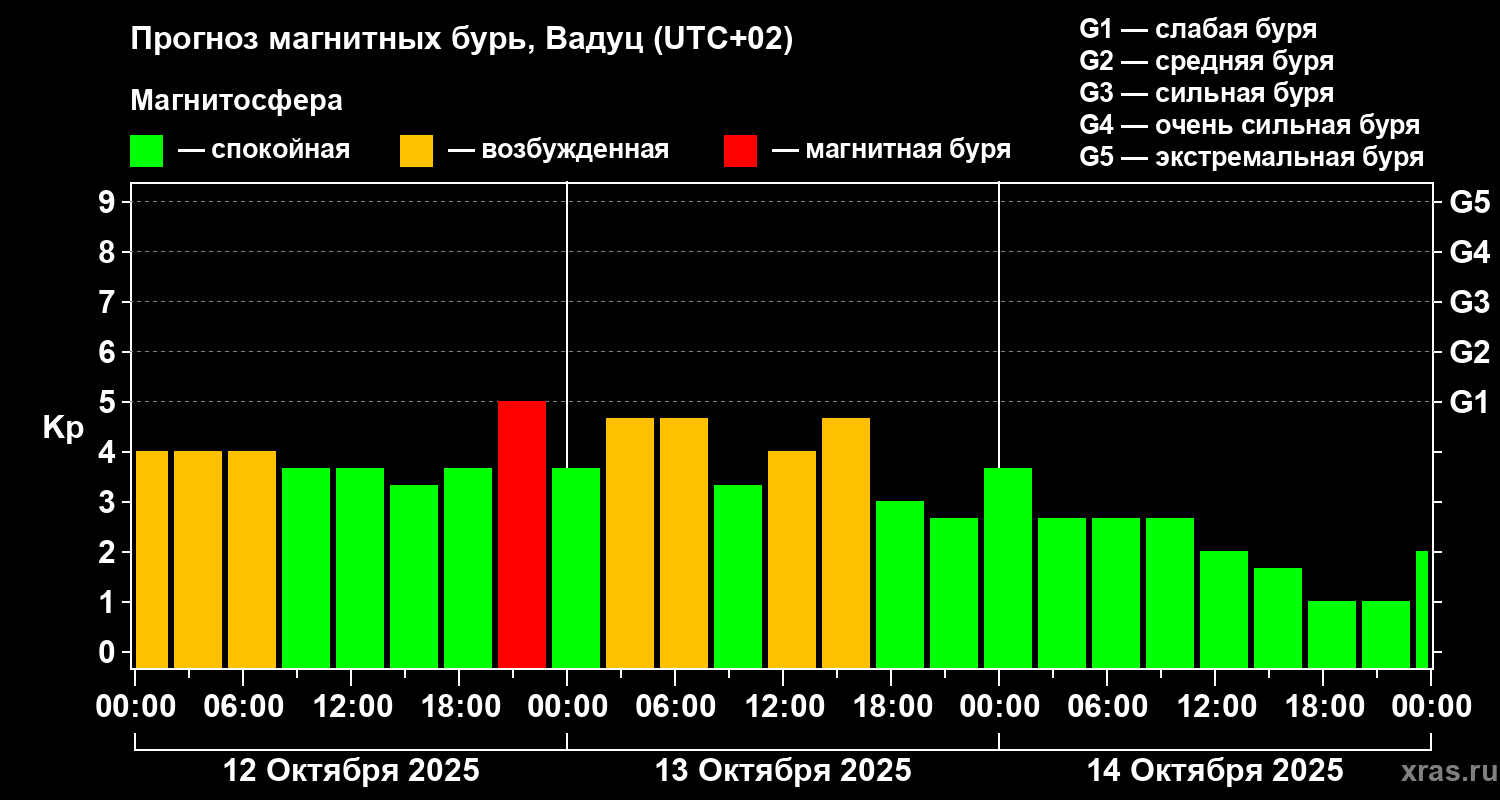 Прогноз магнитных бурь в Вадуце — 12 октября 2025 года