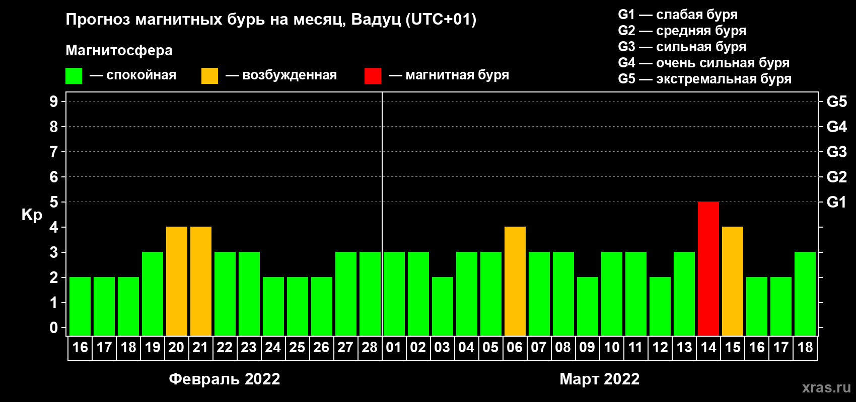 Прогноз магнитных бурь в Вадуце — 16 февраля 2022 года