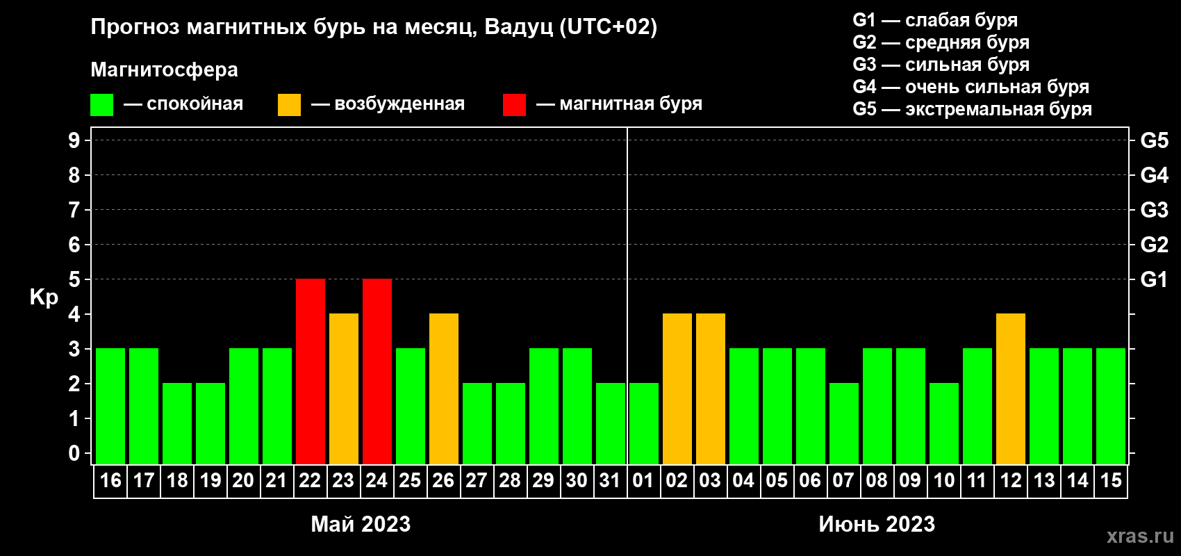 Прогноз магнитных бурь в Вадуце на 16 мая 2023 года
