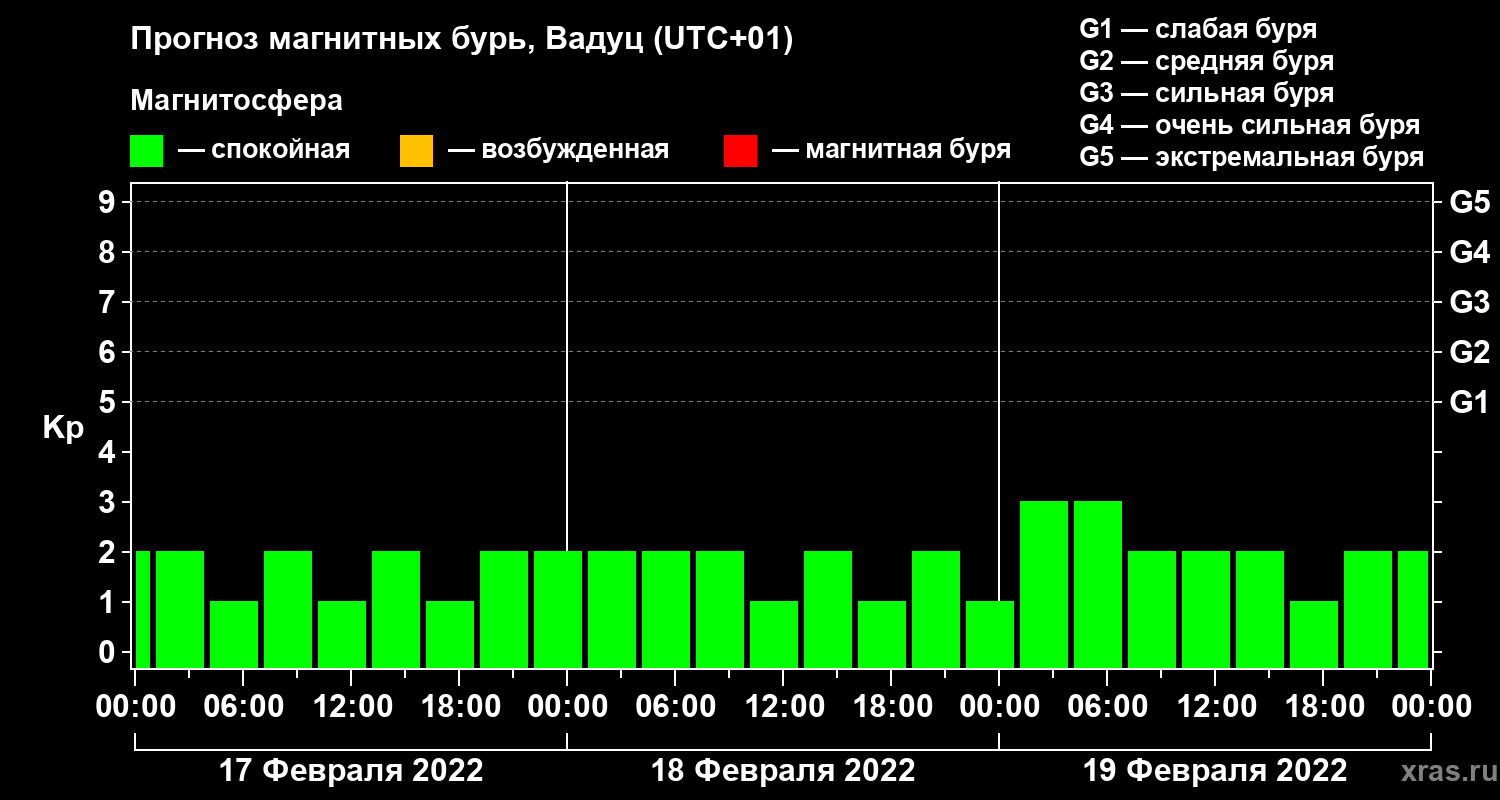 Прогноз магнитных бурь в Вадуце — 17 февраля 2022 года