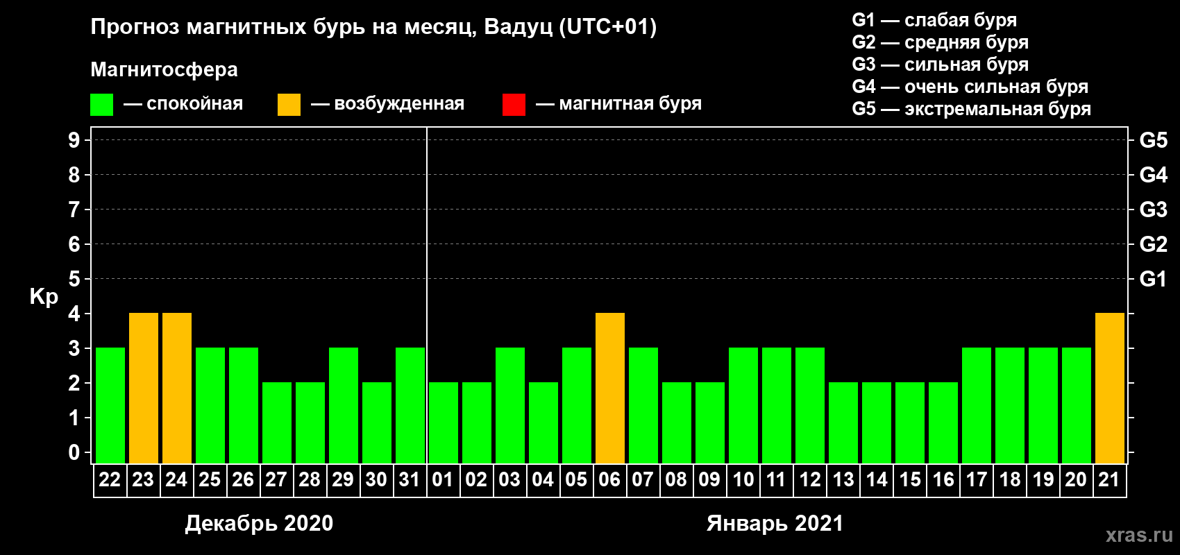Прогноз магнитных бурь в Вадуце — 22 декабря 2020 года