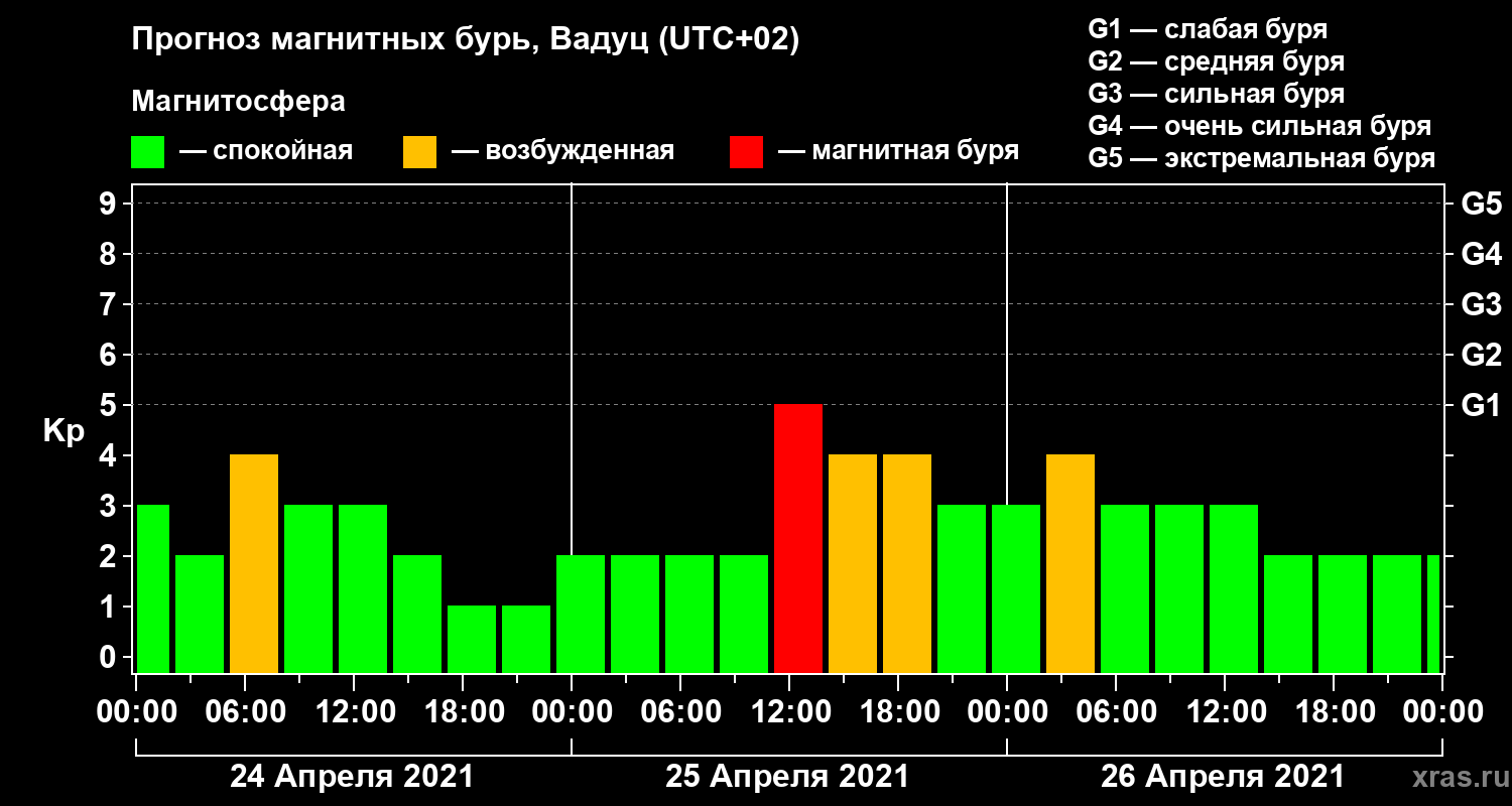 Прогноз магнитных бурь в Вадуце на 24 апреля 2021 года