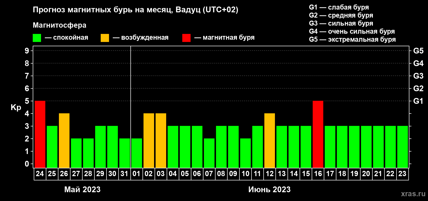 Прогноз магнитных бурь в Вадуце — 24 мая 2023 года