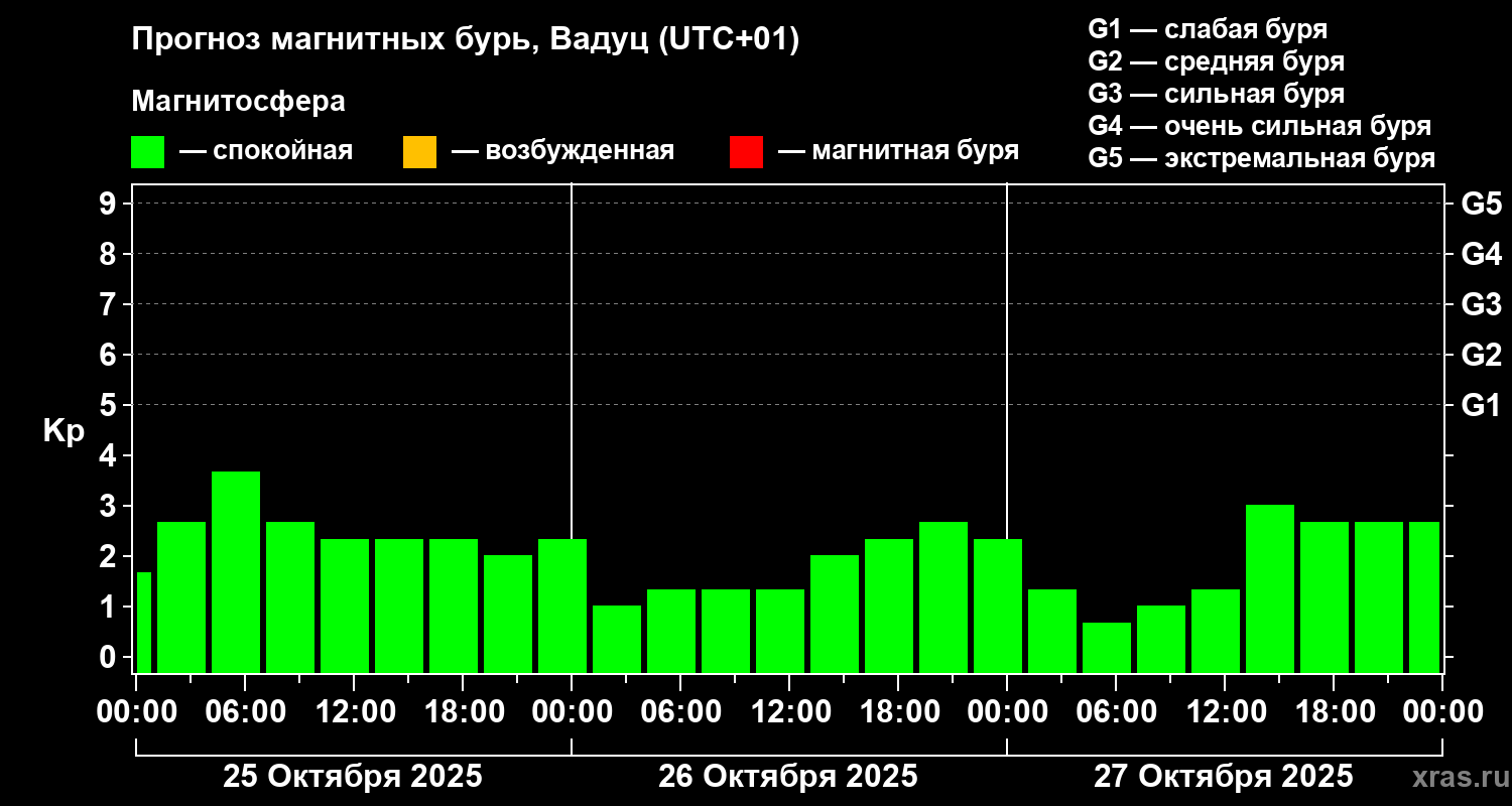 Прогноз магнитных бурь в Вадуце — 25 октября 2025 года