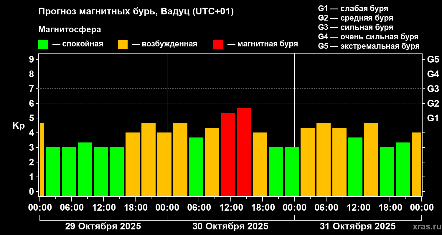Прогноз магнитных бурь в Вадуце — 29 октября 2025 года