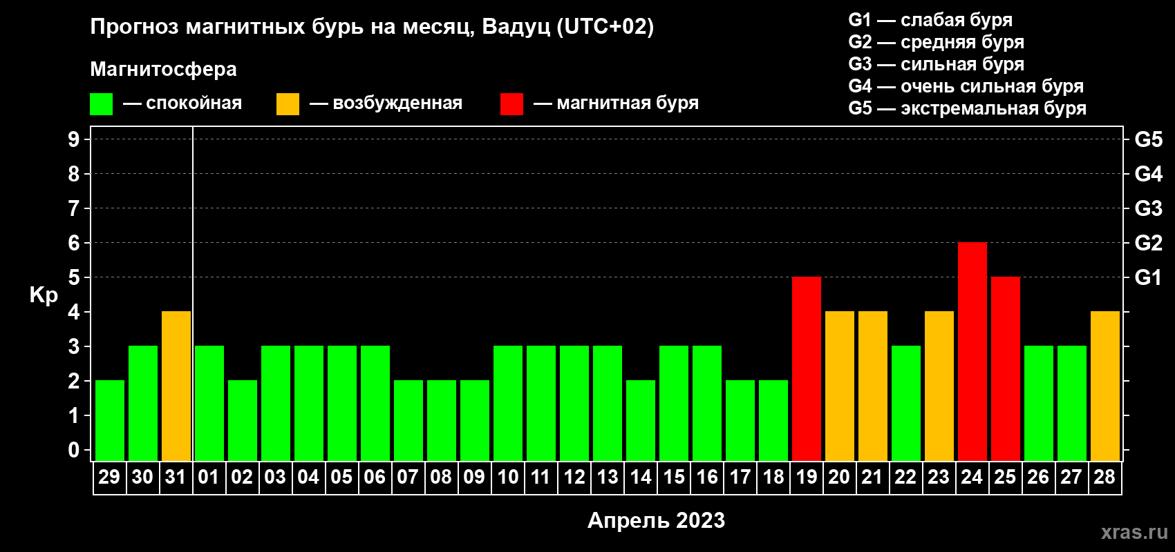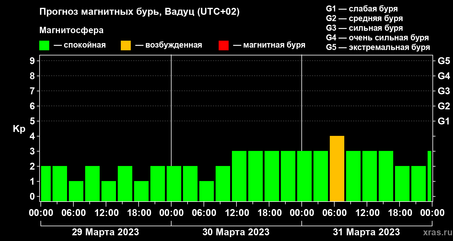 Прогноз магнитных бурь в Вадуце — 29 марта 2023 года