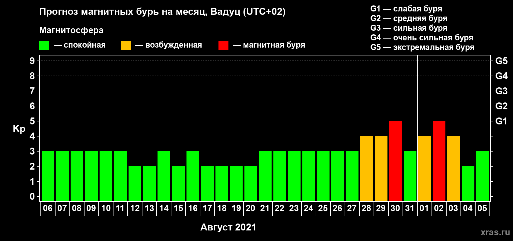 Прогноз магнитных бурь в Вадуце — 6 августа 2021 года