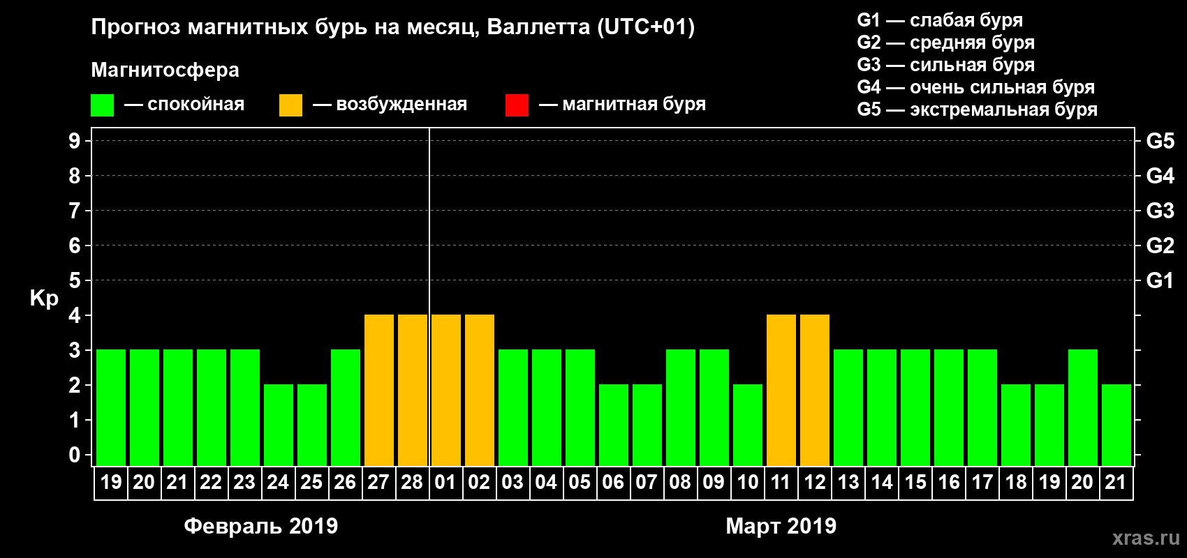 Прогноз магнитных бурь в Валлетте — 19 февраля 2019 года