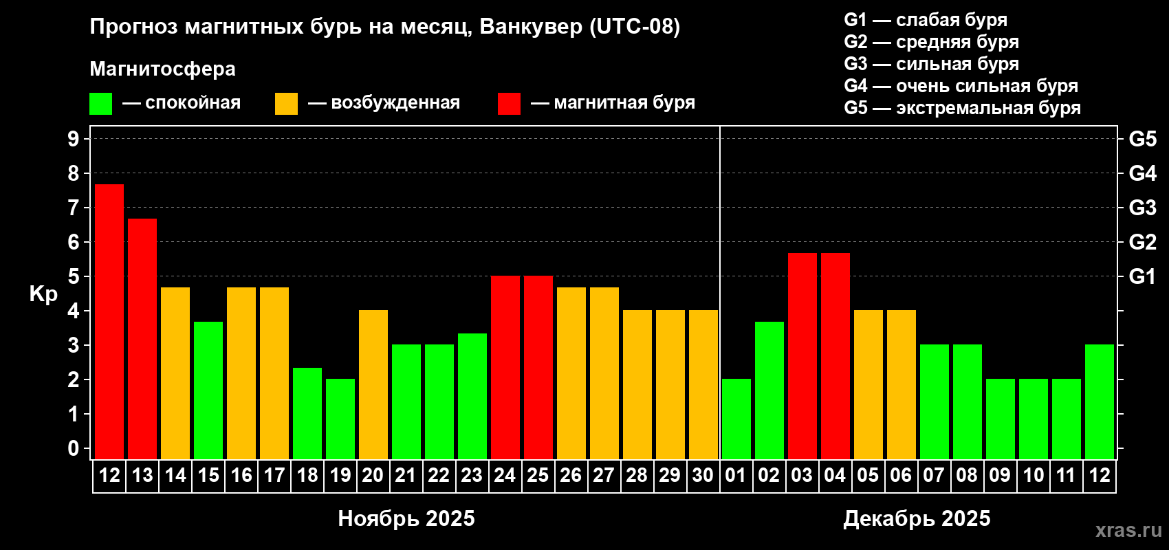 Прогноз магнитных бурь в Ванкувере на 12 ноября 2025 года