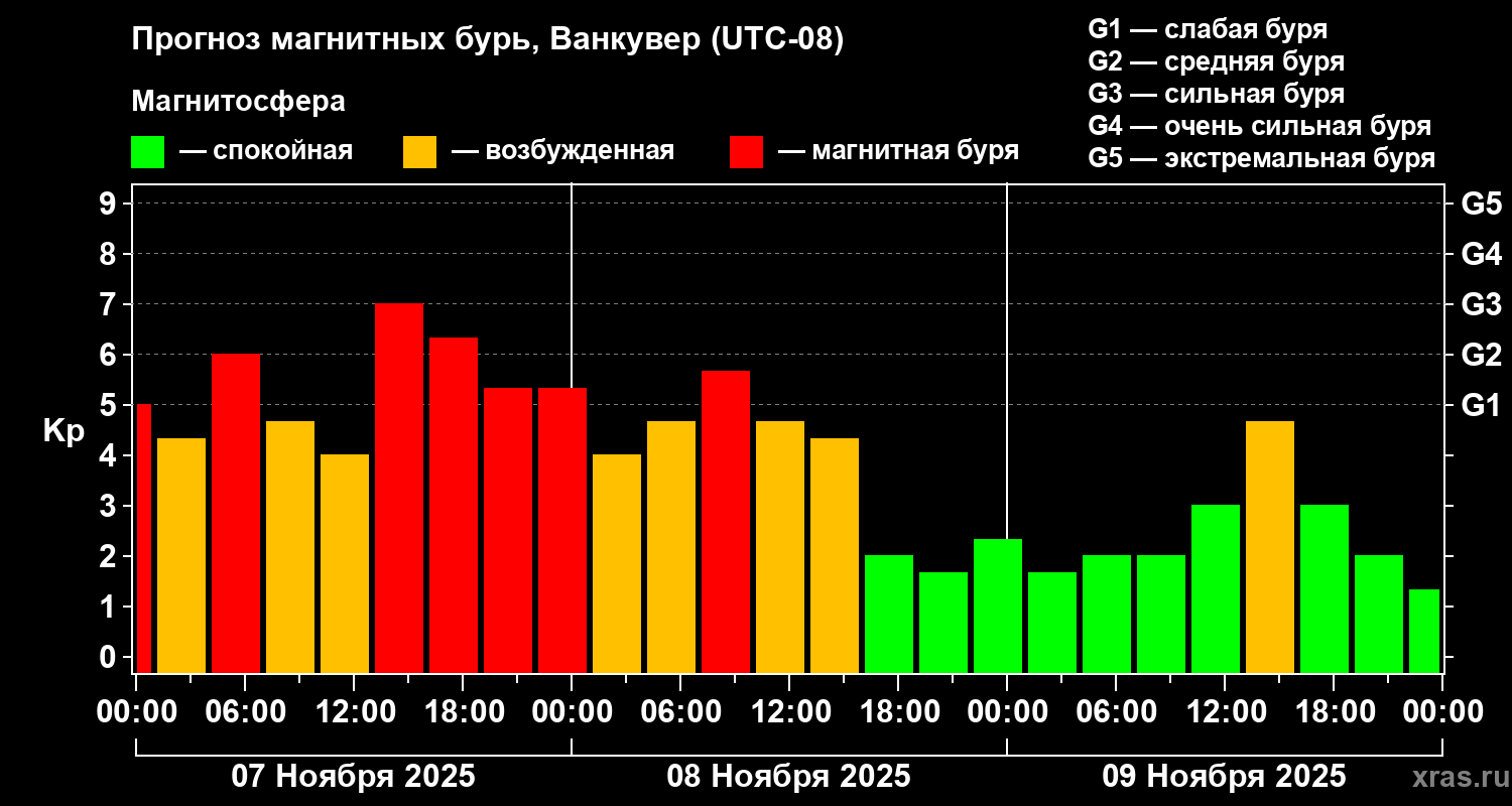 Прогноз магнитных бурь в Ванкувере на 7 ноября 2025 года