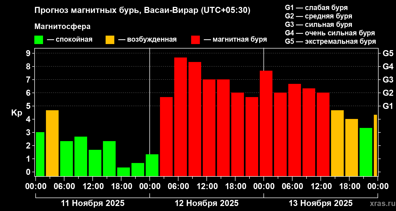 Прогноз магнитных бурь в Васаи-Вираре — 11 ноября 2025 года