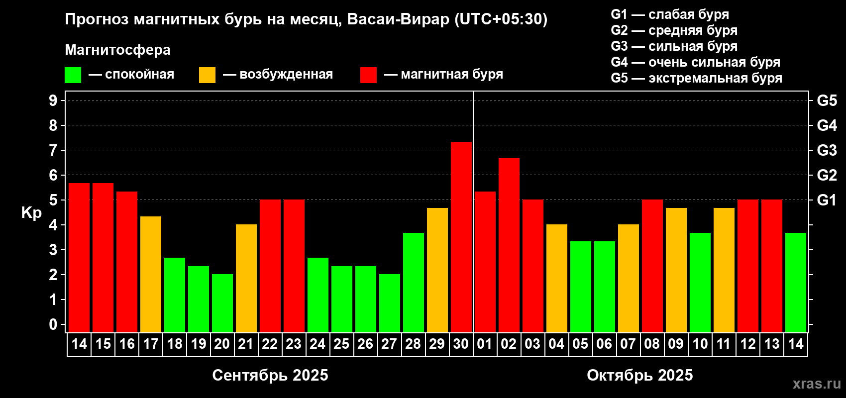 Прогноз магнитных бурь в Васаи-Вираре — 14 сентября 2025 года