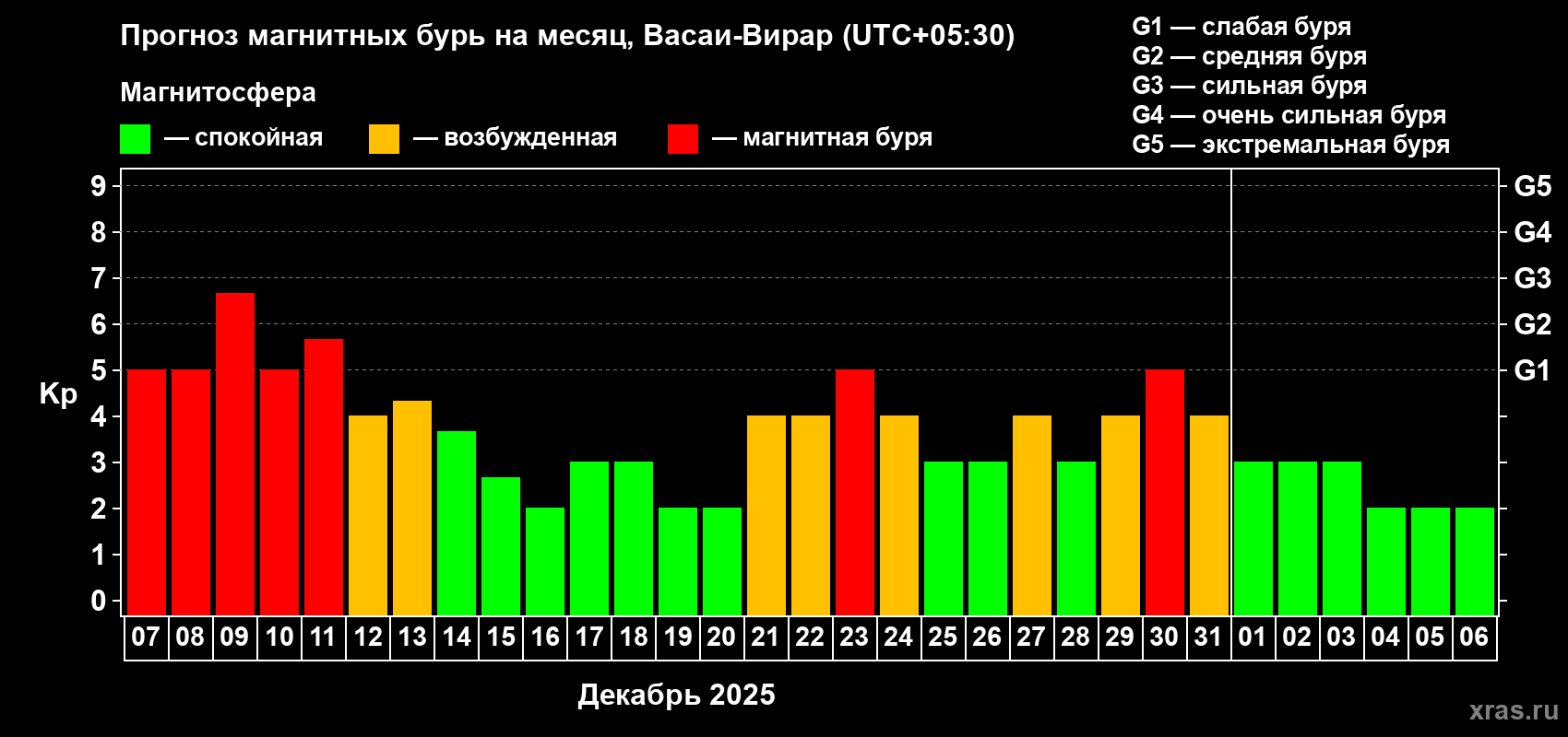 Прогноз магнитных бурь в Васаи-Вираре — 7 декабря 2025 года