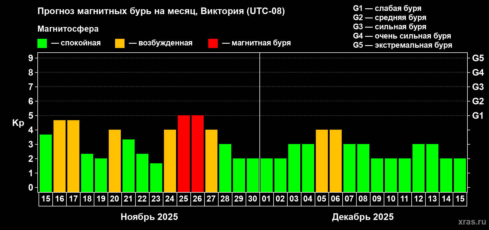 Прогноз магнитных бурь в Виктории — 15 ноября 2025 года