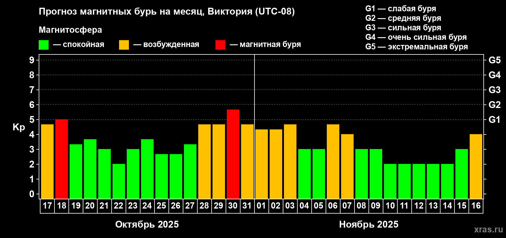 Прогноз магнитных бурь в Виктории — 17 октября 2025 года