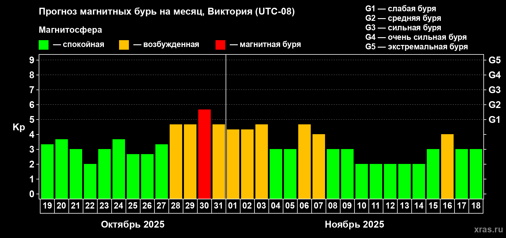 Прогноз магнитных бурь в Виктории — 19 октября 2025 года
