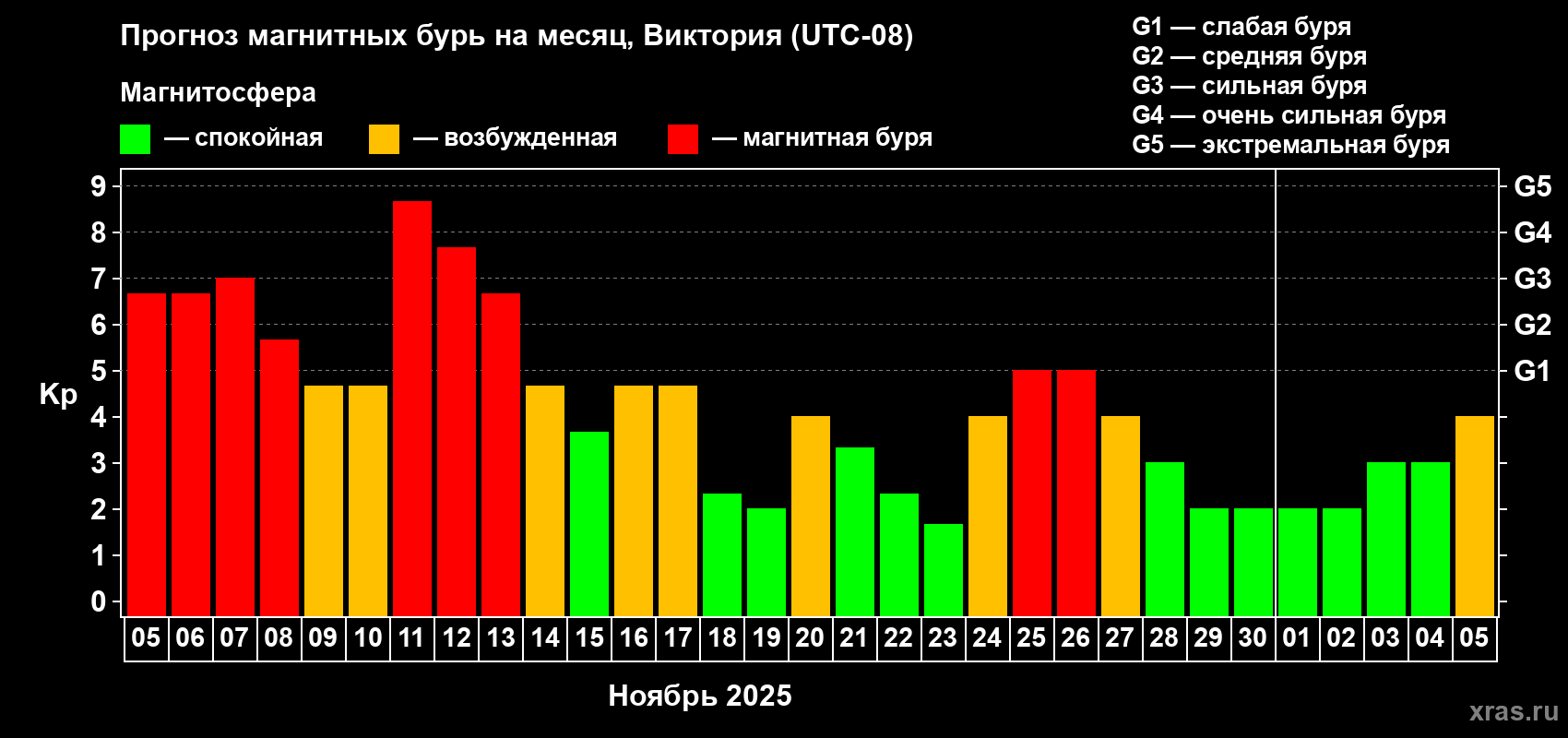 Прогноз магнитных бурь в Виктории — 5 ноября 2025 года