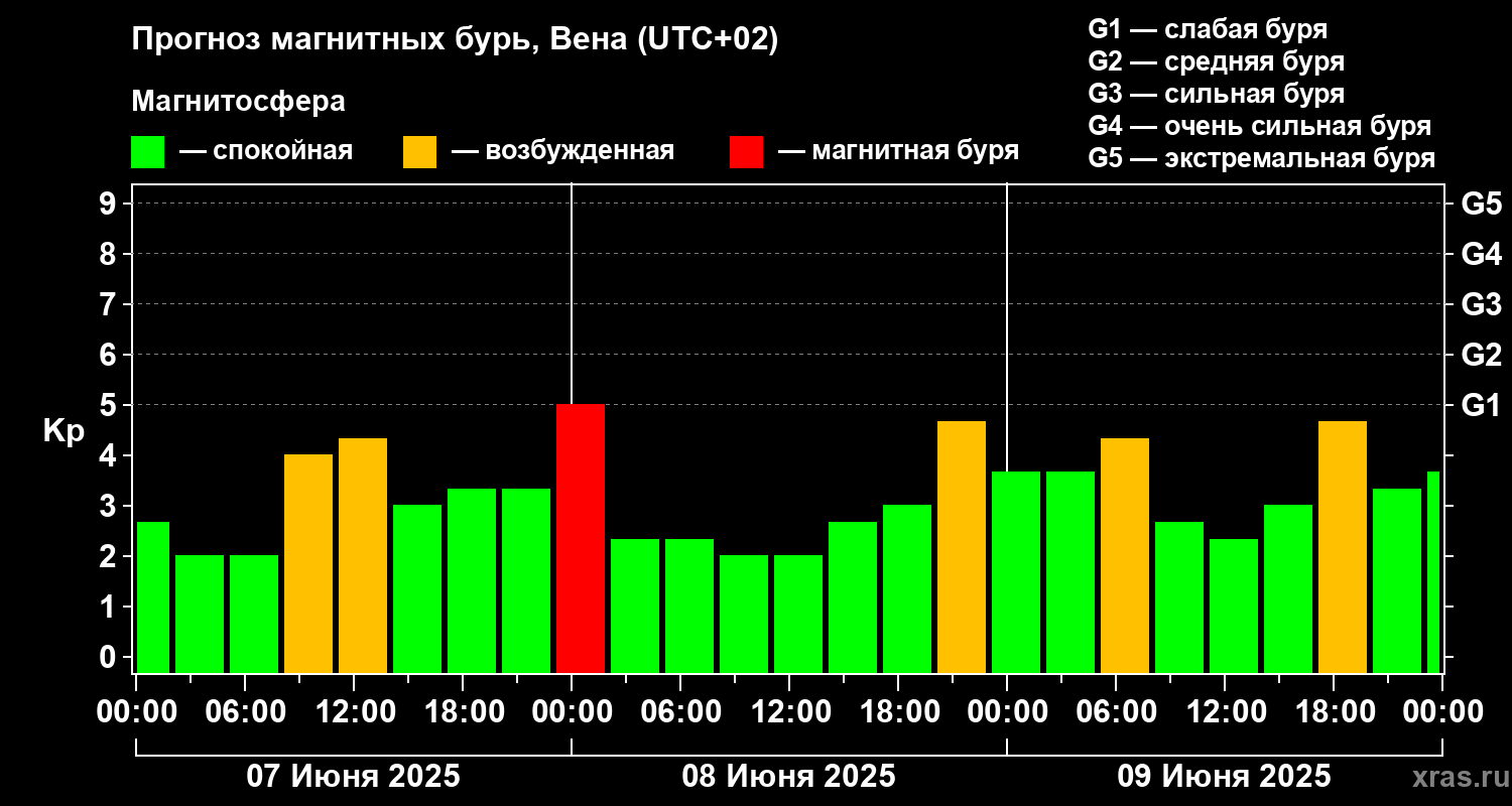 Прогноз магнитных бурь в Вене — 7 июня 2025 года