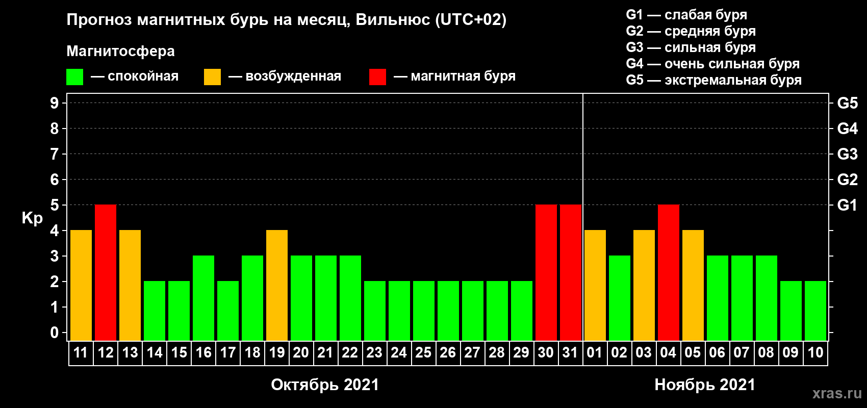 Прогноз магнитных бурь в Вильнюсе — 11 октября 2021 года