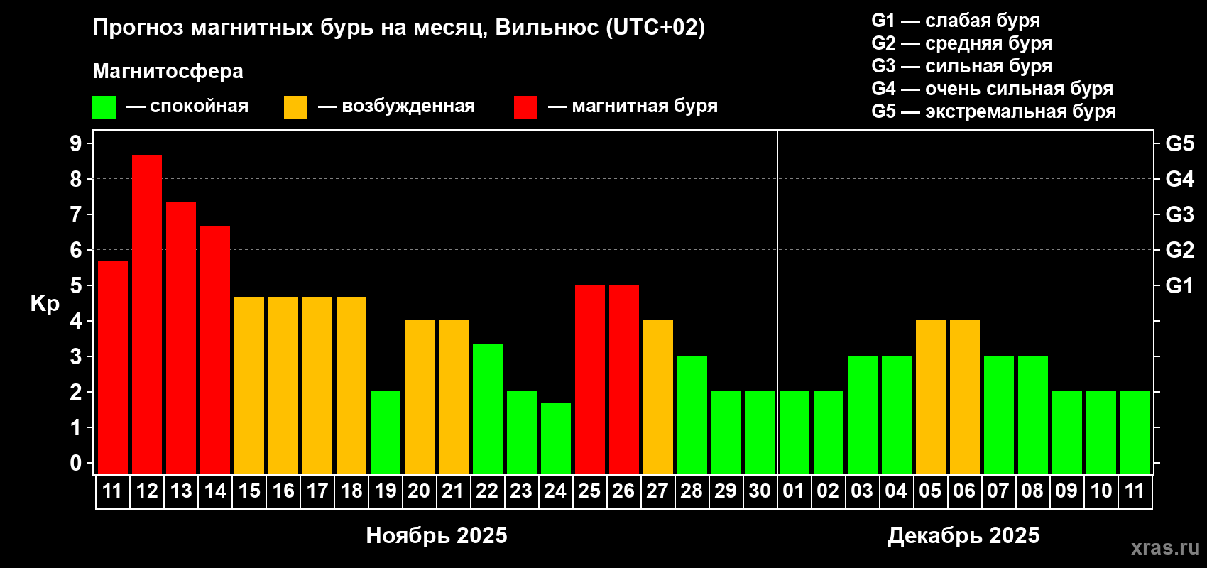 Прогноз магнитных бурь в Вильнюсе — 11 ноября 2025 года