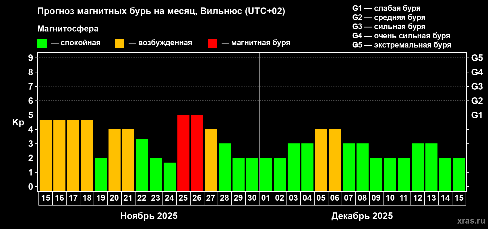 Прогноз магнитных бурь в Вильнюсе — 15 ноября 2025 года